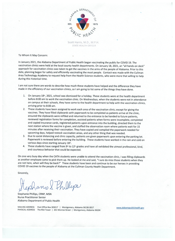 This opportunity came at a perfect time to fulfill the desire many had to help those in our community. The fact that Cullman County CATA Health Science students ages 14-18 were able to assist with a historic event that will shape their healthcare careers is undoubtedly one of the happier stories to come out of this pandemic. We look forward to many more opportunities to help our community agencies in the future.
