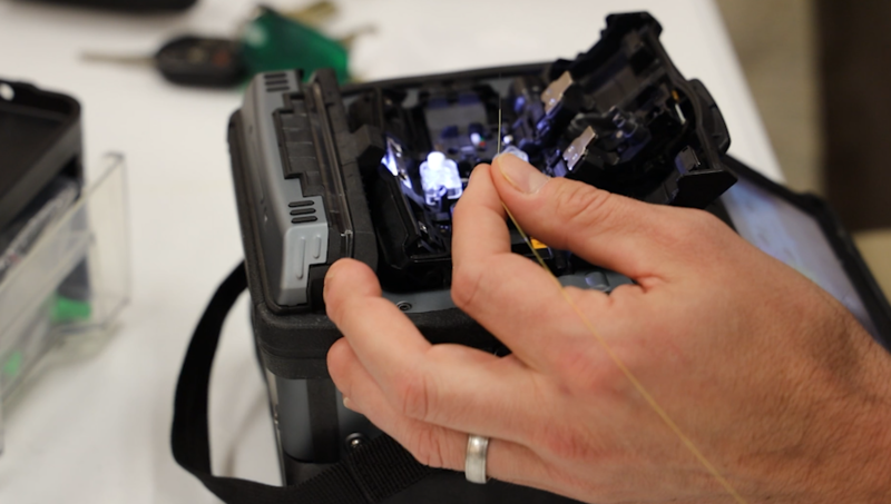 Sprout Fiber Internet Manager of Network Operations Mark Freeman demonstrates how to splice a single strand of fiber optic cable.