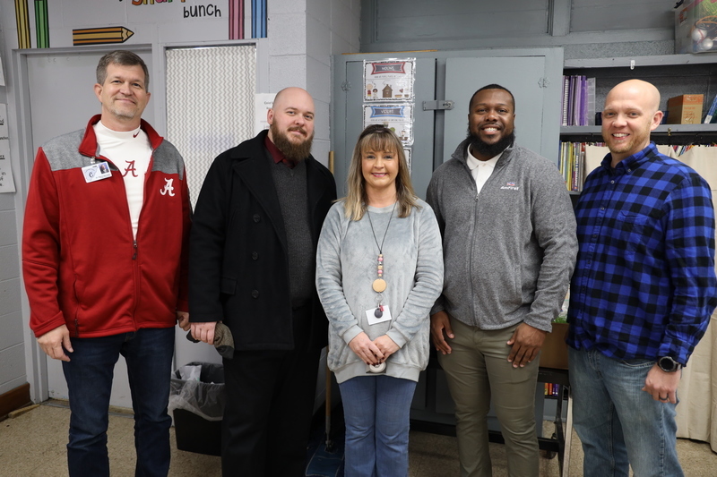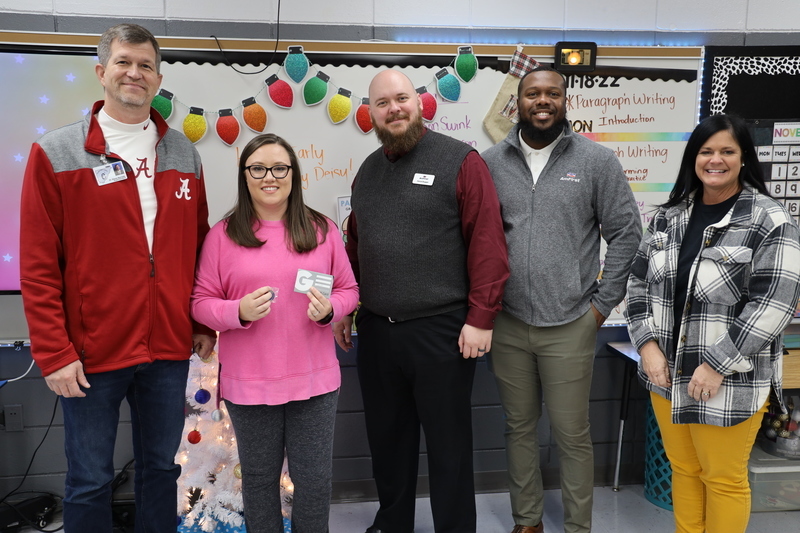 (Dr. Shane Barnette/Cullman County School Superintendent, Melody Martin/AmFirst Teacher of the Month, Daniel Boggan/AmFirst Cullman Branch Manager, Phillip Samuels/AmFirst Regional Development Coordinator, Beverly Jenkins/Good Hope Elementary Principal)