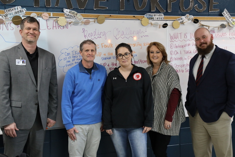 (Dr. Shane Barnette/Cullman County School Superintendent, Scott Brown/Good Hope Middle Assistant Principal, Kalie Faulk/AmFirst Teacher of the Month, Beverly Cochran/AmFirst Membership Development Manager, Daniel Boggan/AmFirst Cullman Branch Manager)